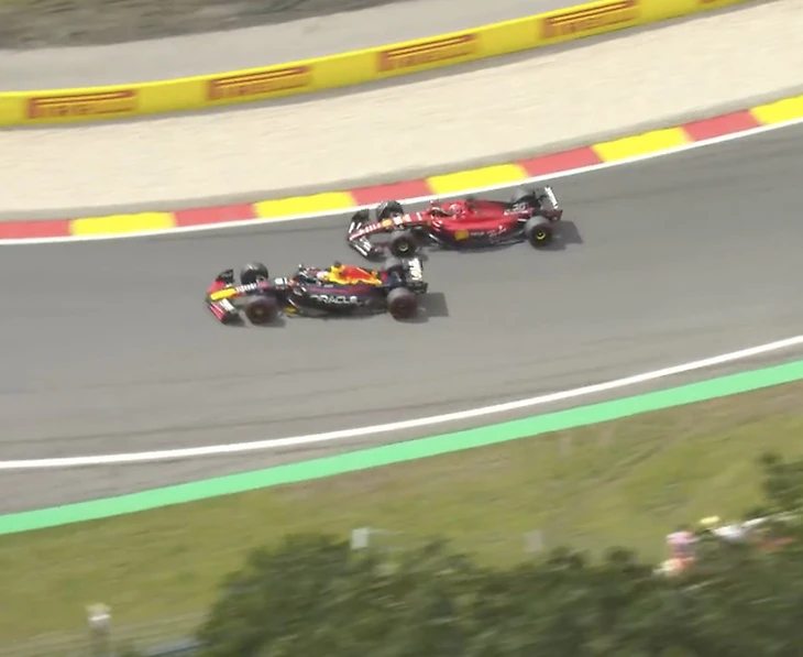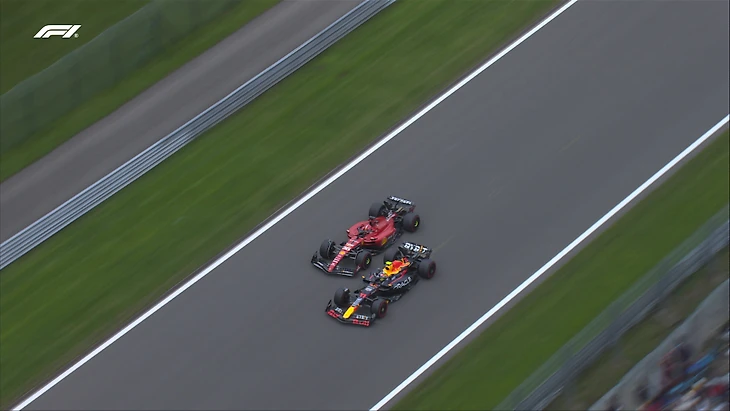 На первой же прямой «Феррари» ничего не смогла сделать с «Ред Булл» - Перес выходит в лидеры. А Ферстаппен - третий!