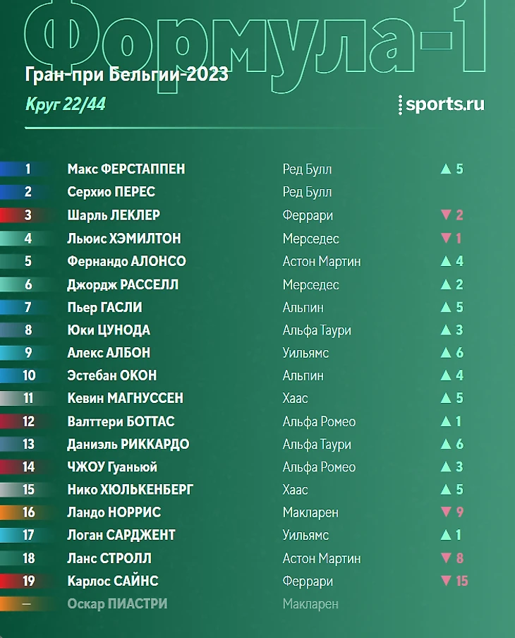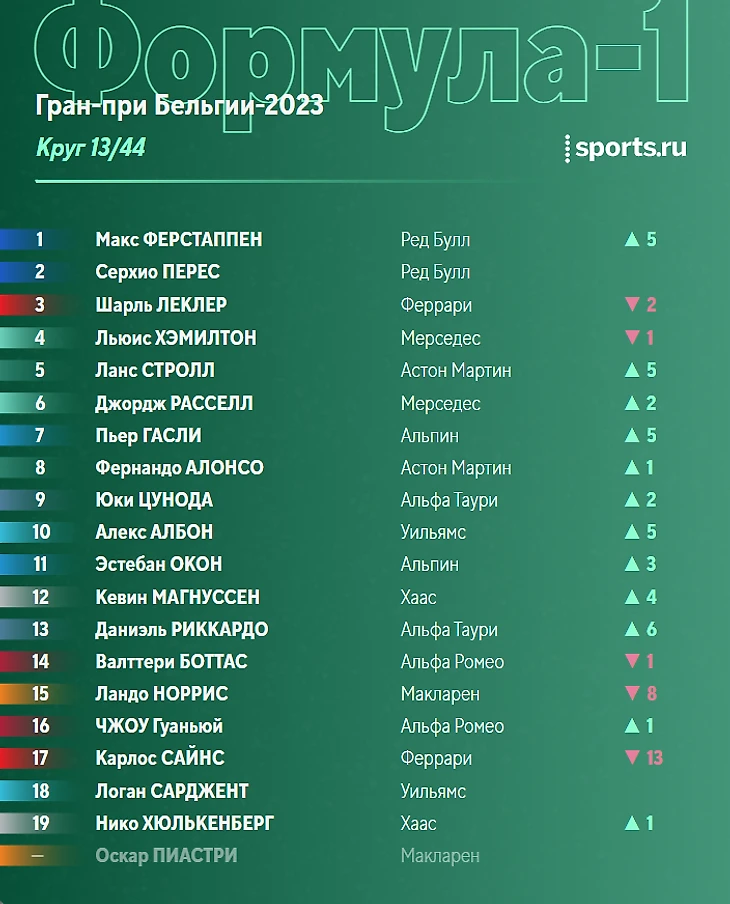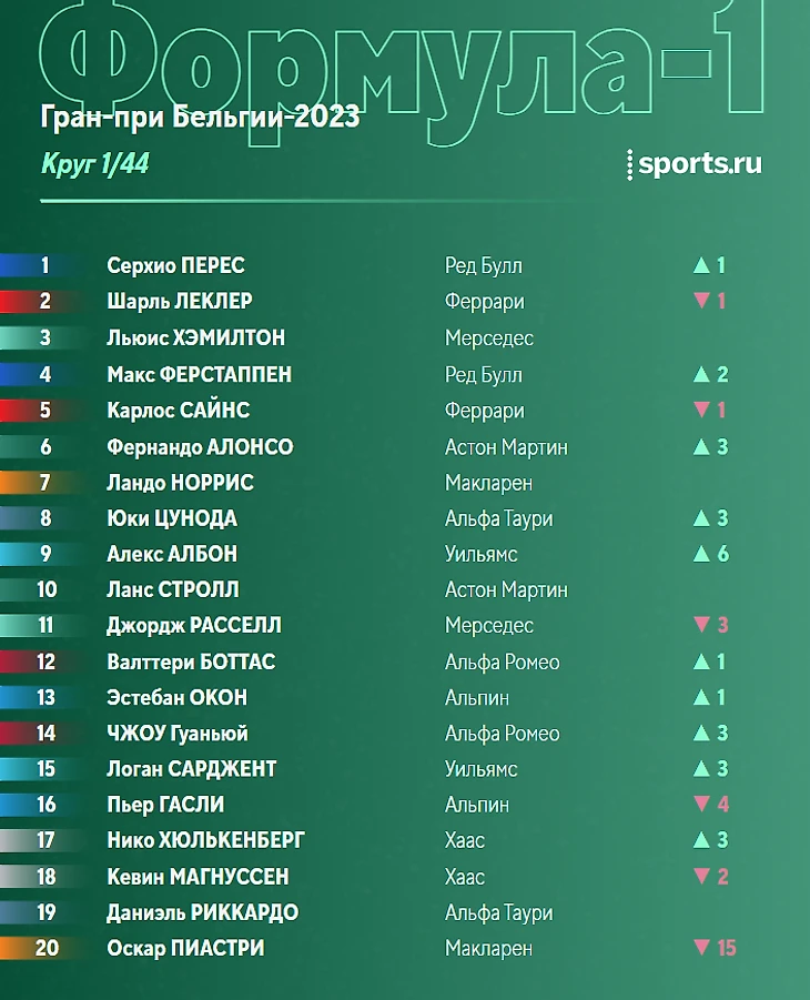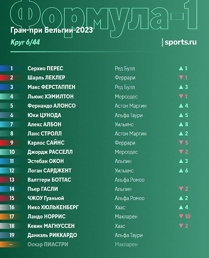 - «Макларен» подвели настройки на дождь. Впрочем, у Пиастри изначально не было шансов после столкновения, а вот Норрис спас что мог и закончил заезд седьмым.