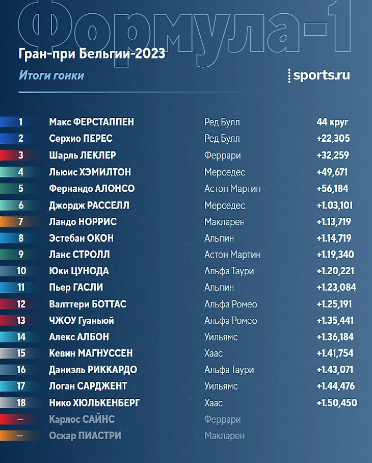 Макс Ферстаппен выигрывает Гран-при Бельгии! Серхио Перес - второй, Шарль Леклер - третий.