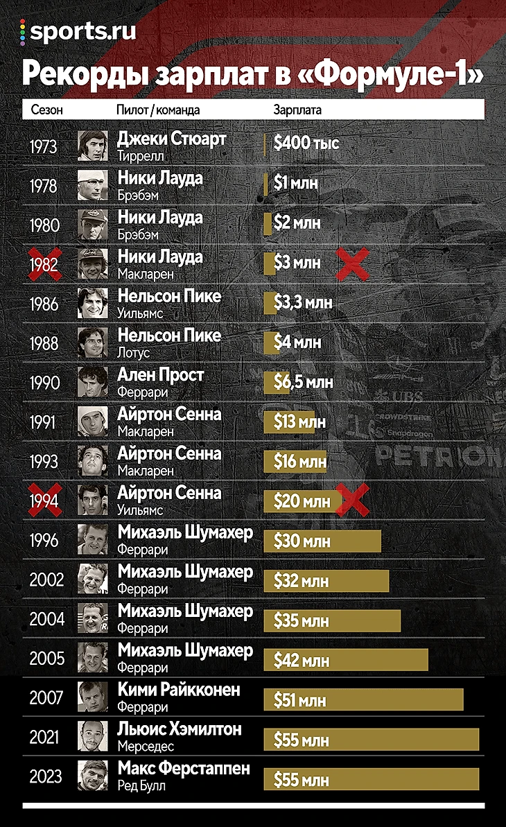 В 2010-х топ-пилоты получали около 20-40 миллионов, и лишь в начале нового десятилетия Льюису Хэмилтону удалось подписать рекордное соглашение с «Мерседесом» на сумму 55 миллионов долларов за сезон, а в 2023-м такую же зарплату получит Макс Ферстаппен из «Ред Булл».