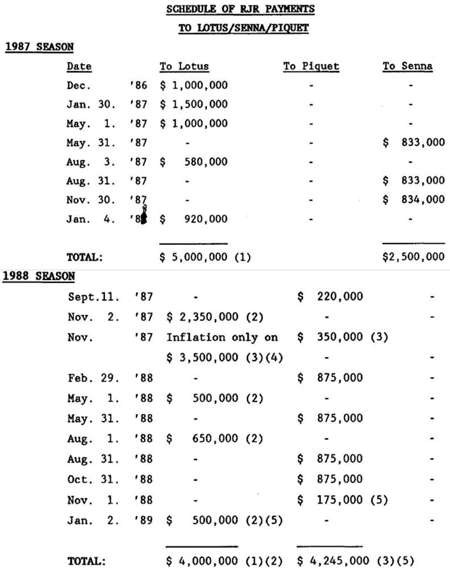 После Лауды самым дорогим пилотом «Ф-1» на несколько лет стал друг австрийца, Нельсон Пике. В «Уильямсе» в 1986-м бразилец получал самые большие деньги благодаря «Хонде», а в 1988-м установил новый рекорд – 4 миллиона долларов (зарплату полностью платила табачная компания с лого в виде верблюда). Что интересно, гонорары Пике превышали остальные спонсорские поступления в команду. Более того, Нельсон мог подобраться даже к 5 миллионам в случае победы в первенстве, но «Лотус» полностью провалился.