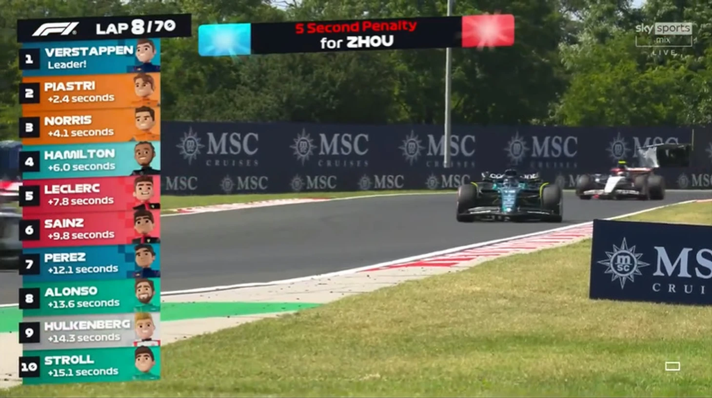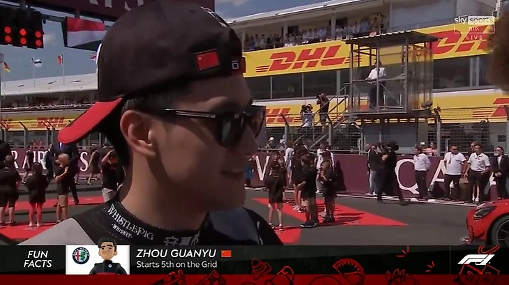 После гимна комментаторы взяли интервью у пилота «Альфа Ромео» Гуаньюй Чжоу. Китаец стартовал пятым, и этот факт отнесли к «забавным»: