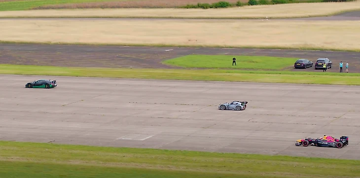 Английская площадка по продаже машин carwow – один из спонсоров «Ред Булл» – регулярно занимается гонками на четверть мили (400 метров) между супермашинами. В этот раз настала очередь выставить чемпионский болид Феттеля 2012-го (800 л.с., 700 кг массы) против двух супертехнологичных электрокаров…
