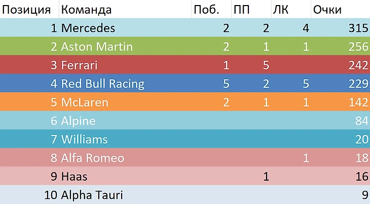 Как можно увидеть, вместо одного «Ред Булла», мы видим другой, но вот борьба за чемпионство в этом зачете выглядит по веселее, чем с Максом.