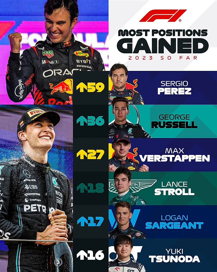 Кто на данный момент отыграл больше всех позиций в сезоне-2023 по сравнению со своим стартовым местом на решётке гонок? Конечно, мистер Серхио «Плохая квалификация» Перес. Мексиканец отыграл на 23 места больше, чем идущий вторым по данному показателю Джордж Расселл - 59 против 36.
