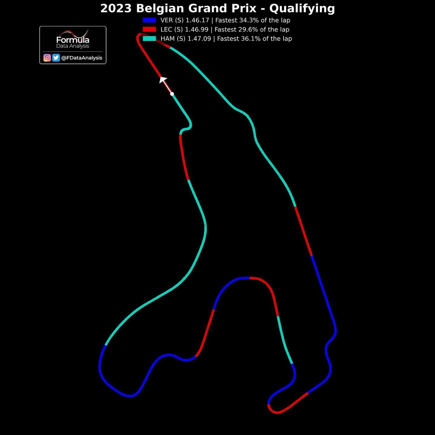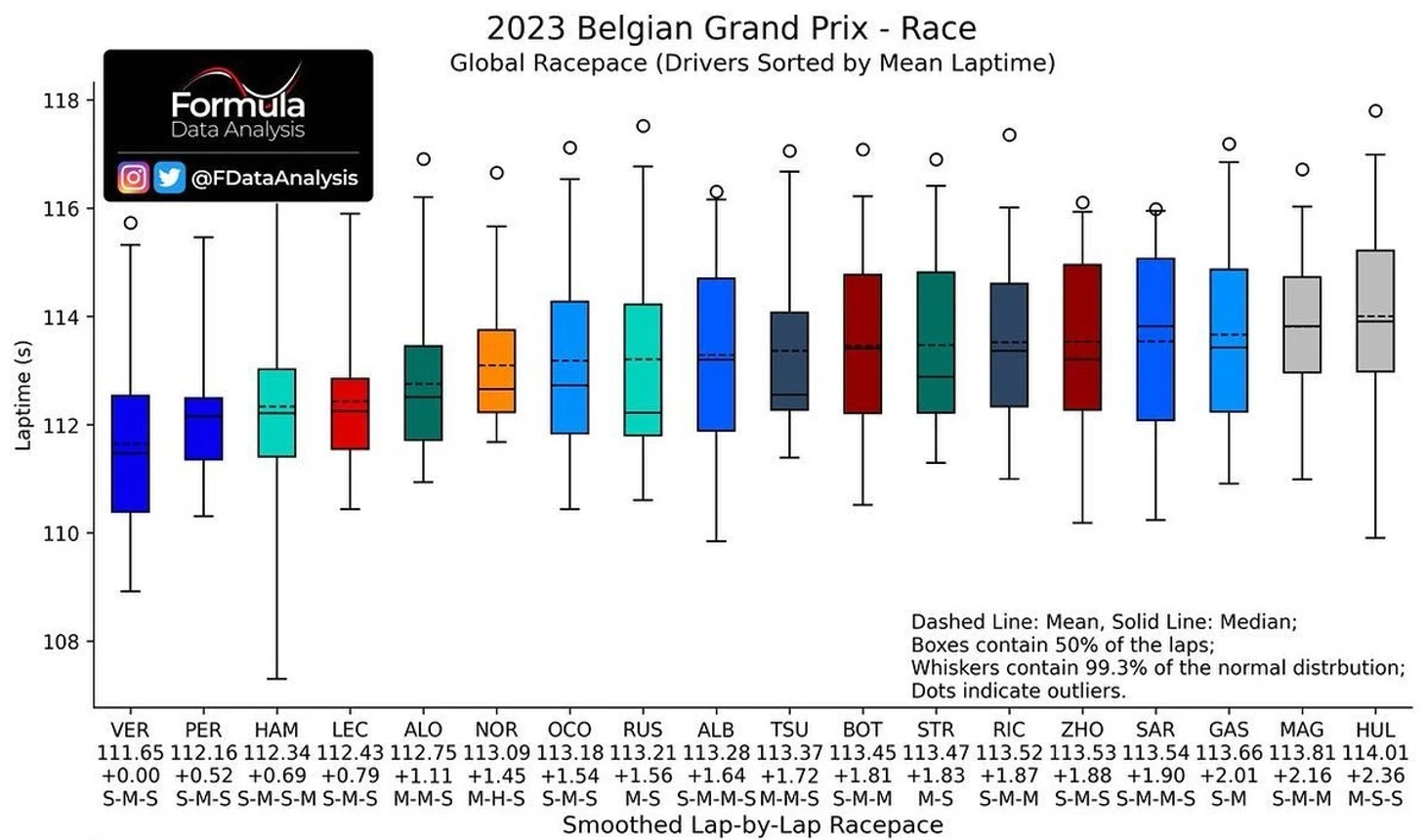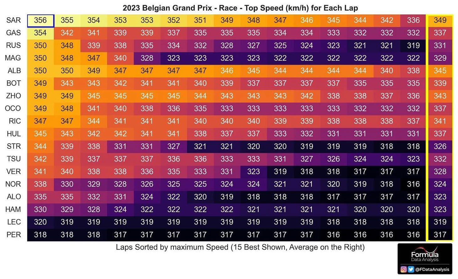 И Ферстаппен с менее агрессивными настройками проезжал вираж быстрее всех – его средняя скорость стабильно выше, чем быстрейшие попытки Серхио. А ведь на Гран-при Бельгии всего 44 круга – то есть чарт описывает буквально треть дистанции!