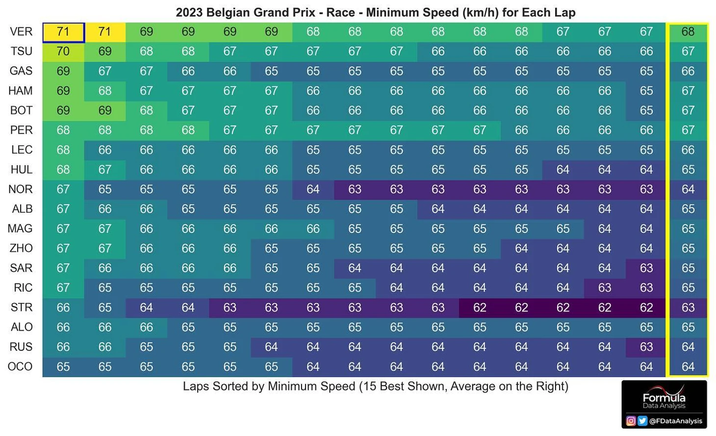 Лучше всего разницу между Максом и Серхио в Бельгии показывает чарт из 14-ти быстрейших времен на самом медленном вираже ( и средняя скорость в нем же):