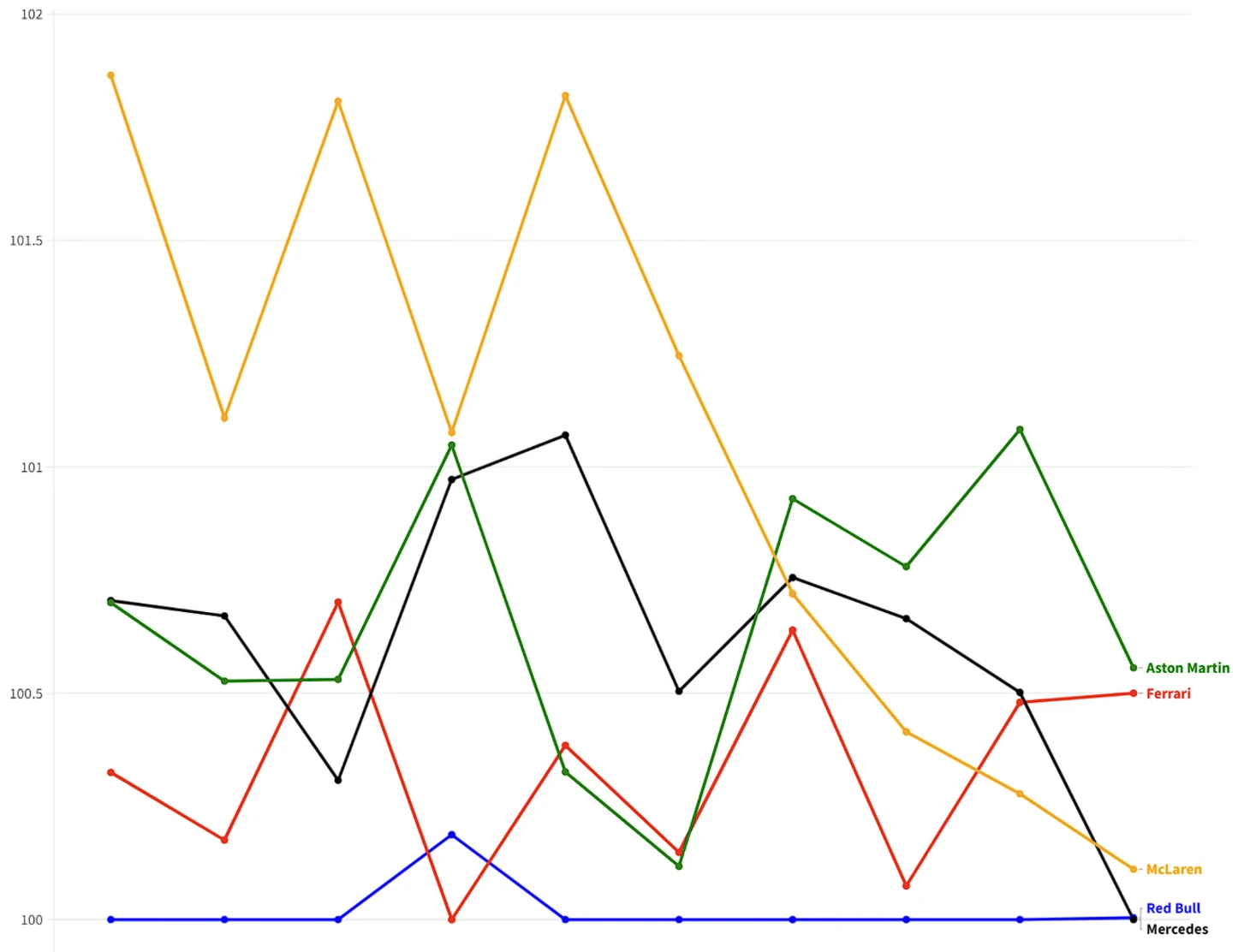 На графике квалификационных характеристик, приведенном выше, на примере автомобилей «Ред Булл», «Астон Мартина», «Феррари» и «Мерседеса» хорошо видны шаги по улучшению характеристик. Начав год с отставанием в 1,8%, команда конкурировала с «Альфа Таури», «Уильямсом» и «Альфа Ромео». Модернизация в Баку позволила опуститься до уровня в 1% и конкурировать уже со средней группой команд.