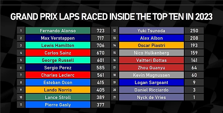 Также ниже вы сможете найти количество кругов, которые пилоты проехали за 12 гонок в очковой зоне (топ-10). Испанский дед - самый стабильный пилот сезона:
