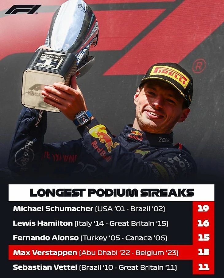 Рекорд всея Формулы-1 по подиумам подряд принадлежит Михаэлю Шмумахеру, легендарный немец приезжал в топ-3 на 19 этапах подряд - с США-2001 по Бразилию-2002. Как минимум, рекорд «Ред Булла» по данному показателю Макс уже обновил, превзойдя 11 подиумов кряду в исполнении Себастьяна Феттеля.