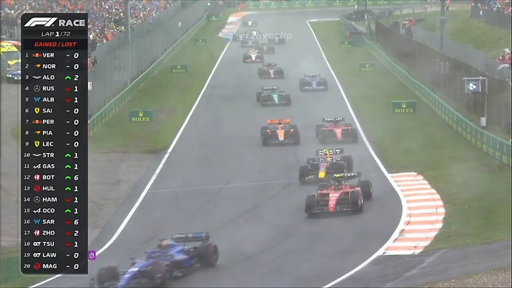 – Алонсо обогнал Леклера на 6-м круге и поднялся на 5-е. Пересу параллельно передали возвращении дождя через 8-10 кругов.