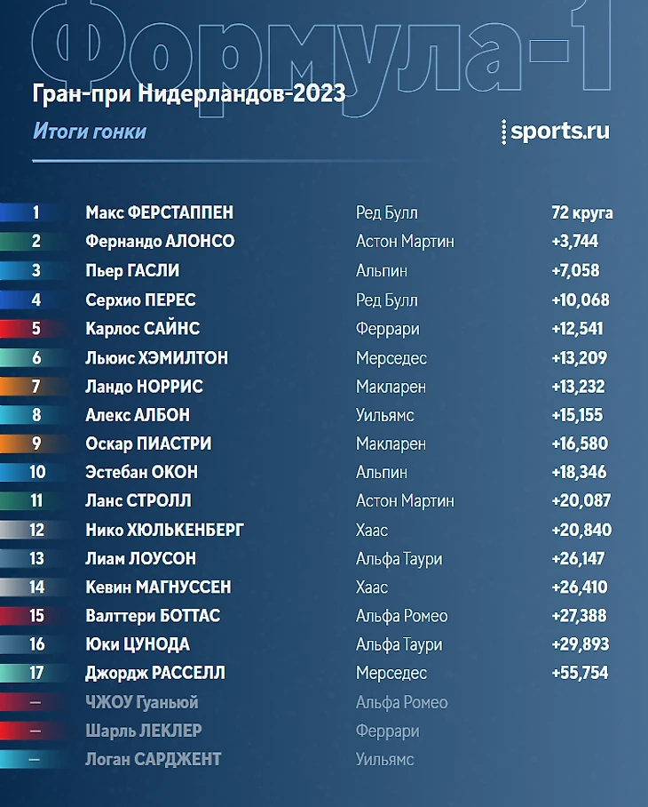 Макс Ферстаппен все-таки победил – в 9-й раз подряд. Фернанло Алонсо долетел на втором месте – и забрал лучший круг. Третье уплыло Пьеру Гасли – из-за штрафа Пересу! Серхио свалился на 4-е – едва финишировал перед Сайнсом.
