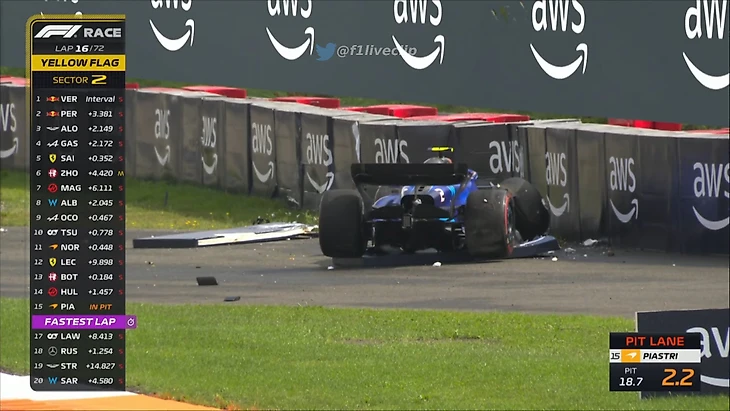 Включился режим виртуального автомобиля безопасности, все поехали в боксы за дождевыми шинами, а затем – красный флаг. Перес остановился на середине пит-лейн из-за внезапной остановки – откатился на 6-е! Гасли таким образом оказался 3-м.