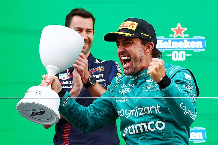 Казалось, испанец спокойно едет на подиум после обоих «Ред Булл», но на следующей волне пит-стопов «Астон Мартин» замешкался с его покрышкой и задержал Алонсо на 8 секунд: