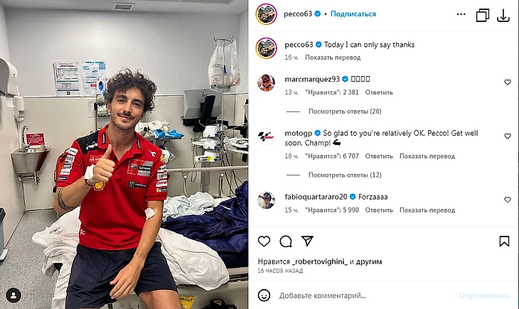 «Пекко в порядке, – рассказал в эфире DAZN главный медик MotoGP Анхель Чарте. – У него обнаружена сложная политравма, ведь мотоцикл наехал на него в области бедра и большеберцовой кости. Но рентген показал только небольшие повреждения в этой области – пока мы даже не знаем, новое оно или уже старое. Шейный, грудной и брюшной отделы в порядке.