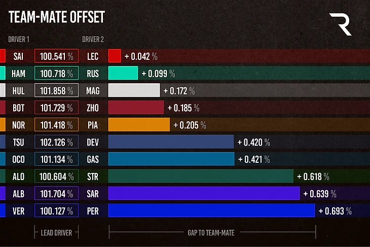 На одном круге Карлос тоже не настолько медленнее Шарля, как считается. Бывший технический директор «Ягуара», «Стюарта» и «Джордана» Гэри Андресон в колонке на The Race сравнил напарников по принципу «супервремен» (быстрейшее время на круге каждого гонщика с каждого уик-энда сопоставляют с быстрейшим временем уик-энда в принципе и высчитывают среднее за сезон – 100% можно получить, если ты сам постоянно быстрейший, а все, что выше – отставание. Идея – «если один пилот способен проехать на этой машине такой круг, то другой технически тоже имеет такую возможность»).