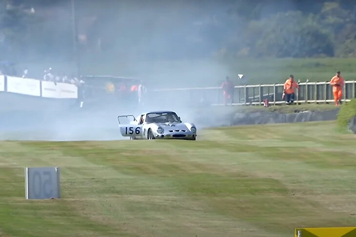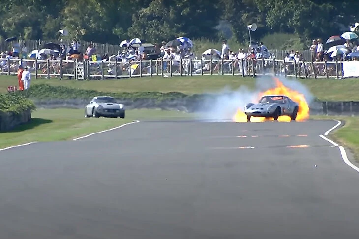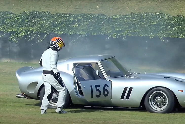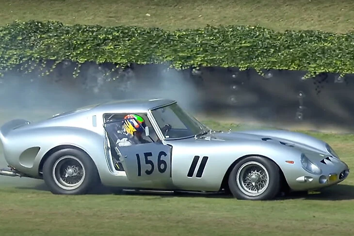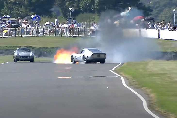 Этот страшный момент – с заезда Lavant Cup, проведенного на фестивале Goodwood Revival в честь 60-летия победы на местном треке Грэма Хилла. Для него собрали десяток разных «Феррари» класса ГТ 60-66 годов – взорвавшаяся, например, 250 GTO. Они выпускались с 62-го по 64-й, произвели только 36 экземпляров, и до нынешнего времени дожили далеко не все. Они настолько редкие и уникальные, что в 2018-м одна такая ушла на аукционе за рекордные $75 млн (4-е место на «Ле-Мане»), а вообще «Феррари» тех лет и тех серий даже выгоревшими и развалившимися покупают за миллионы долларов.