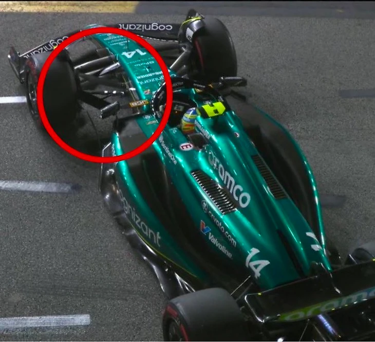 Что же случилось с его «Астон Мартин»? Фанаты испанца изучили онборды его гонки нашли момент, с которого и начались его беды: на машине №14 на втором круге отсоединился корпус одного из пилонов левой стороны подвески: