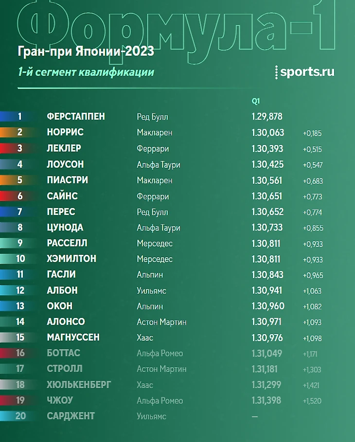Топ-10: Ферстаппен, Пиастри, Норрис, Леклер, Перес, Сайнс, Хэмилтон, Расселл, Цунода и Алонсо.