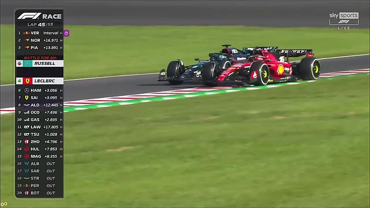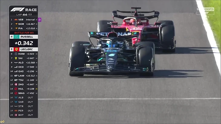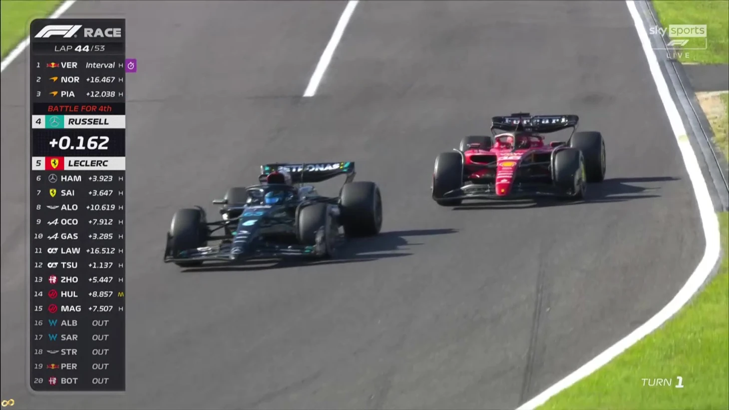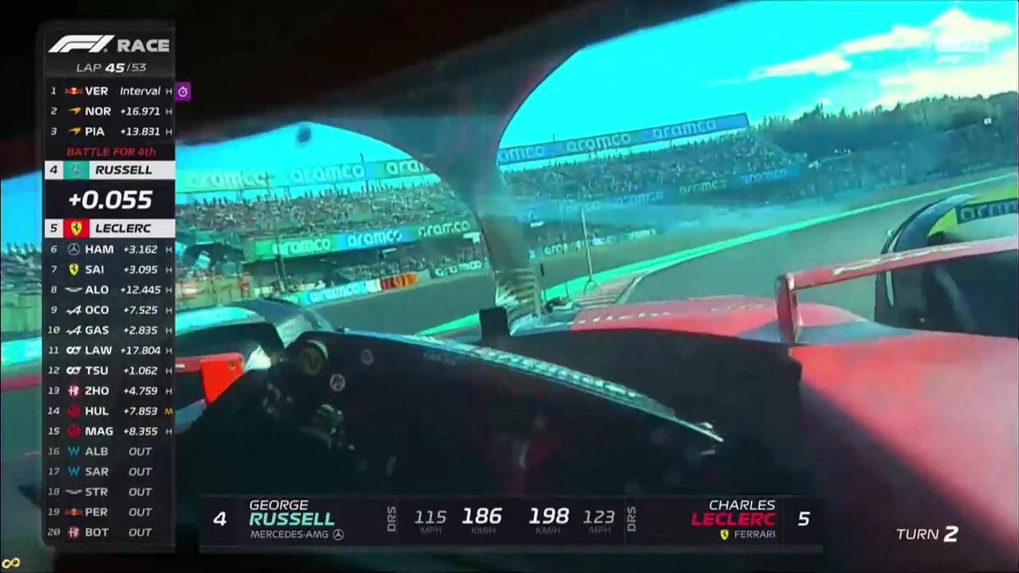 На 45-м круге Леклеру все же удалось нырнуть внутрь поворота бок о бок с Расселлом и удержаться впереди!