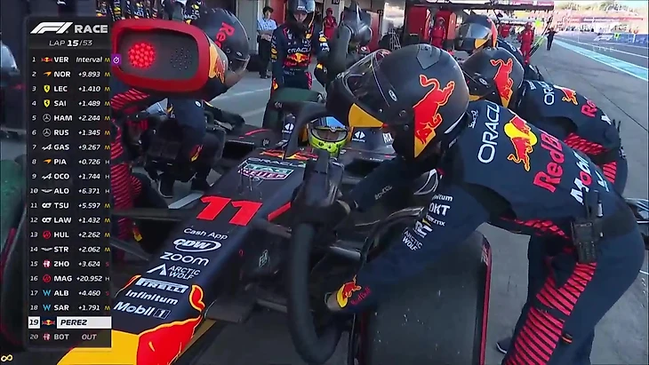 Пиастри тут же нырнул в боксы за свежими шинами. Вернулся на трассу 9-м.