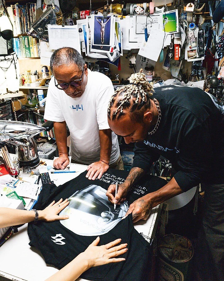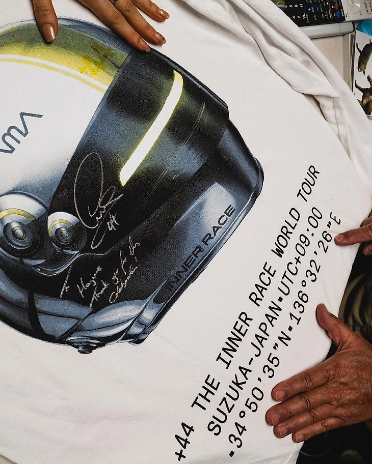 Хэмилтон с начала сезона запустил свою марку +44, где для каждого этапа кооперируется с известным дизайнером или художником и выпускает ограниченную линейку одежды. Для Японии ее назвали Man vs Machine («Человек против Машины»):