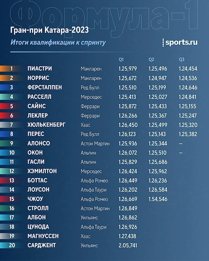 – Пиастри все-таки дотерпел до победы в спринте! Ферстаппен финишировал вторым, Норрис вырвал третье, а Хэмилтон добил-таки «Феррари» на последнем круге, а Албон на «Уильямсе» забрал 8-е и последний зачетный балл у Алонсо. А на ленточке Алекс еще и едва не обошел Леклера.