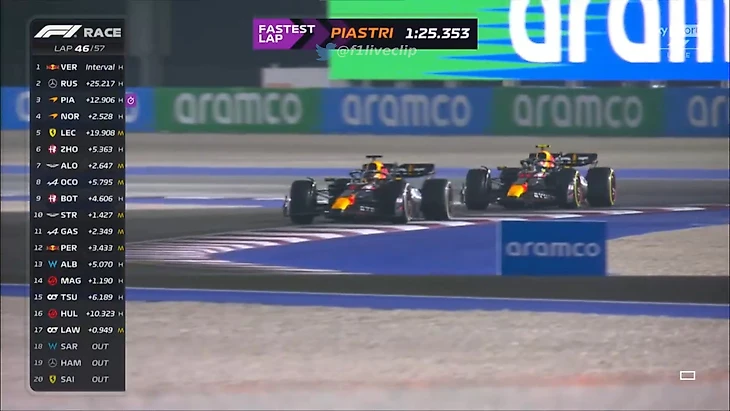– На 44-м круге «Макларен» выдал финальный пит-стоп Пиастри в 2 секунды. Следом обслужили и Леклера с Пересом.