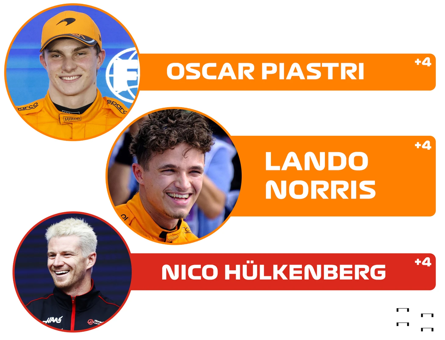 Сразу четверо гонщиков ко второму кругу поднялись в протоколе на 4 позиции (причем все они начали заезд с четной стороны стартовой решетки) - это Оскар Пиастри, Ландо Норрис, Нико Хюлькенберг и Кевин Магнуссен. Отмечу, что всем этим пилотам сыграла на руку авария пилотов «Мерседес» (об этом чуть ниже), а гонщикам «Хаас» - еще и отсутствие на стартовой решетке Карлоса Сайнса.
