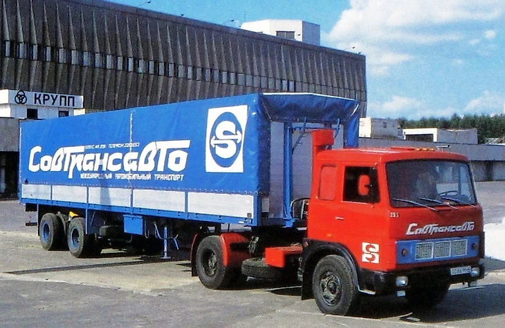 Над внешним видом поработали и в «Совтрансавто», для которых «МАЗ» тоже продолжал готовить технику. Унылые грузовики серого цвета перекрасили в бодрый оранжевый.