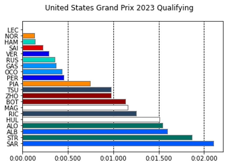 На графике показана разница между поул-позицией и лучшим кругом гонщика, показанного в квалификации Гран-при США 2023 года. Разница указана в секундах.