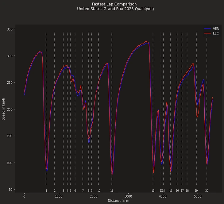 Сравним лучшие круги в квалификации Гран-при США 2023 года сравним круги обладателя поул-позиции Шарля Леклера и Макса Ферстаппена. У Макса списали лучший круг, поэтому в сравнении был представлен, тот круг Макса, который был засчитан.