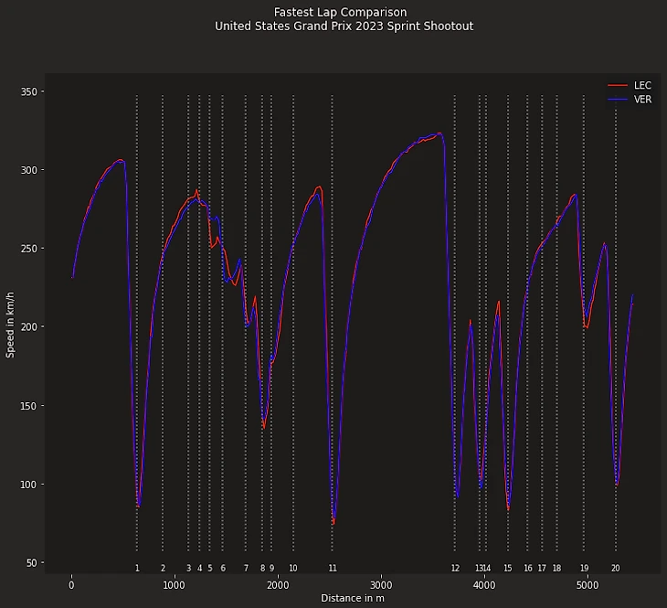 Сравним лучшие круги в спринте шутаута Гран-при США 2023 года снова сравним круги обладателя поул-позиции Шарля Леклера и Макса Ферстаппена.