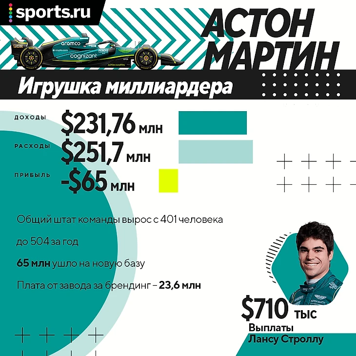 Личные деньги акционера и его активов – не единственные поступления «Астон Мартин». У зеленой команды навалом крупных спонсоров – от саудовского нефтегиганта Aramco до it-конгломерата Cognizant. Только в 2022-м рост выручки от спонсоров составил 39 миллионов! Оттуда и поступления в 231 млн против дохода в 182 миллиона в 2021-м. Бизнес команды все-таки растет.