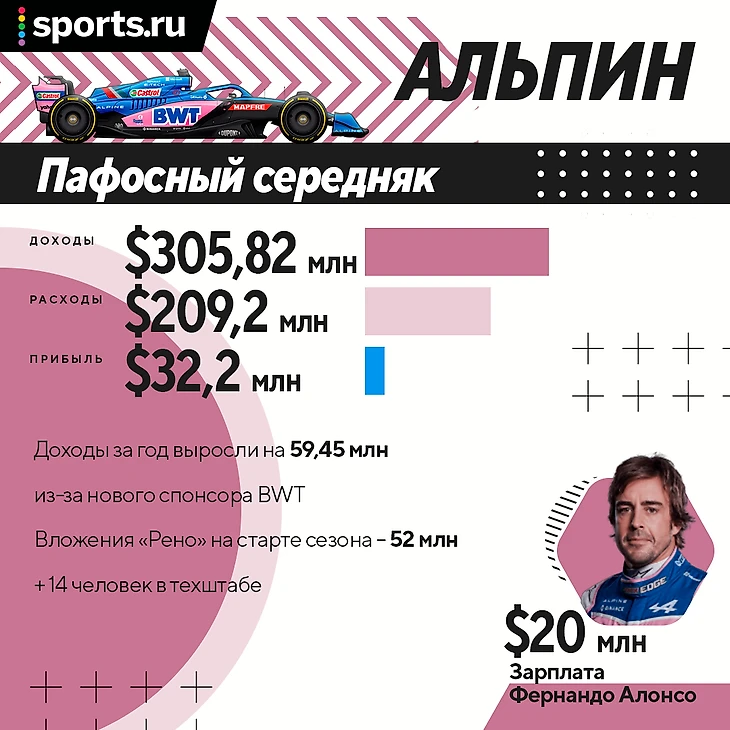 Выручка команды в 2022-м прибавила аж 23,6% и добралась до 305,82 млн благодаря вложениям нового спонсора BWT, пришедшего вместе с боссом Отмаром Сафнауэром из бывшего «Рейсинг Пойнт». В 2023-м Отмара уволили – большой вопрос, останутся ли в организации австрийцы и их деньги.