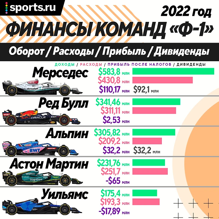 Но правда ли команды «Ф-1» теперь меньше тратят, больше зарабатывают, получают прибыль и даже теперь приносят владельцам дивиденды? Изучили на основе отчета самой богатой, чемпиона, пафосного середняка, игрушки миллиардера и аутсайдера, страстно мечтающего о дополнительных инвестициях в базу и завод – «Мерседеса», «Ред Булл», «Альпин», «Астон Мартин» и «Уильямса». Они удобны для сравнительного изучения и сопоставления, ведь все базируются в Великобритании, а по законам Королевства каждая компания их типа обязана пройти и опубликовать финансовый аудит на специальном портале – и каждую осень профильная британская пресса следит за бумагами и подбивает все денежные результаты. Правда, мы все перевели из фунтов стерлингов в более привычные доллары по среднегодовому курсу.