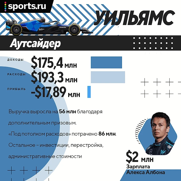 Однако финансовый отчет раскрывает, насколько у «Уильямса» все на самом деле плохо. Под потолком расходов – на машину и команду – потратили только 86 млн, остальные деньги ушли на административные расходы, маркетинг и содержание огромного исторического автопарка победных чемпионских болидов прошлого. И это еще в 2022-м команда получила 56 миллиона дополнительных призовых и бонусов от «Ф-1» после активации нового Договора согласия – однако точка безубыточности еще далека. Тем не менее, в прошлом году вся выручка команды составила 117 млн – остальные 100 млн в бюджет добавили новые владельцы Dorilton Capital, иначе легендарных англичан ждало бы банкротство.