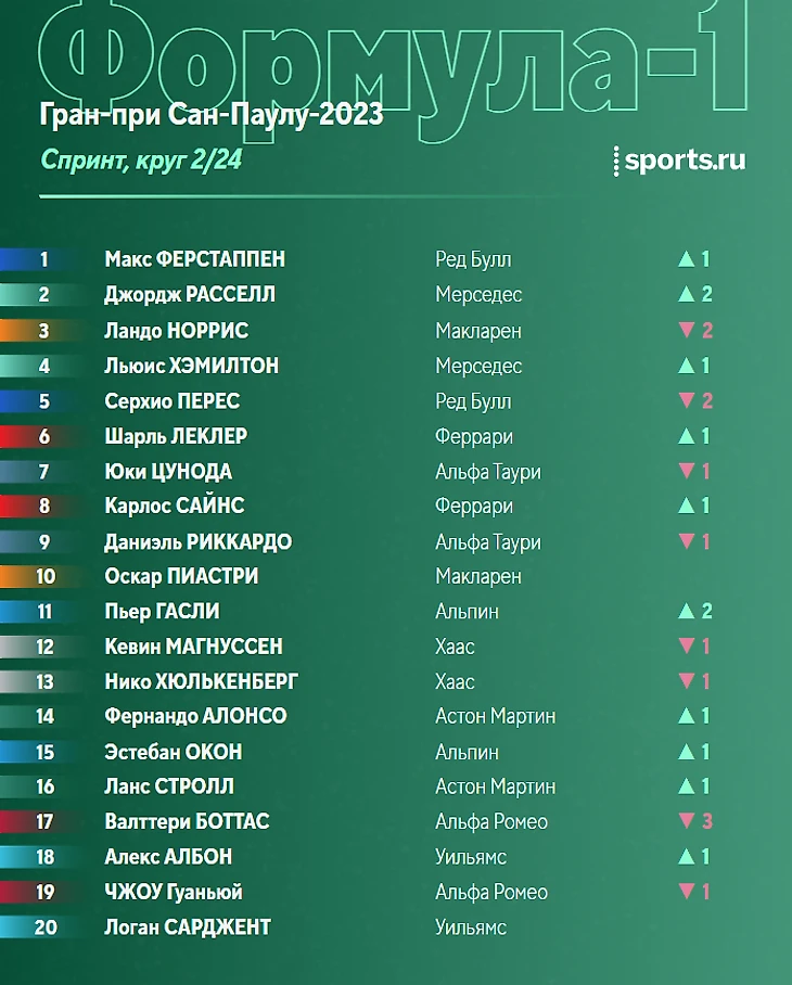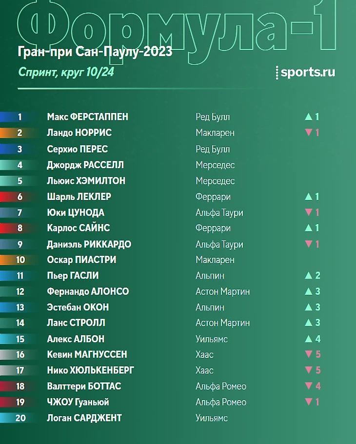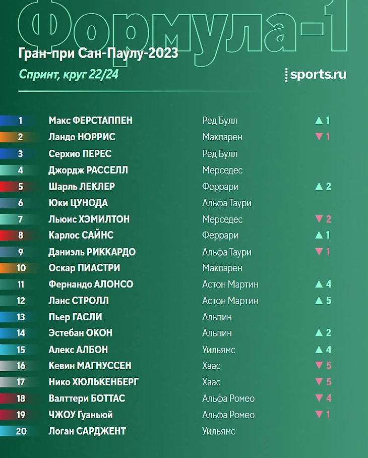 - У «Ред Булл» вообще нет проблем. Болид здорово держался на «софте», темп есть даже у Серхио Переса. Если завтра ничего не случится, то это очередная уверенная победа Ферстаппена. - А вот Норрис снова без триумфа. Пилоту «Макларена» все никак не удается одержать первую победу в карьере - даже если это просто спринт. Радует, что хотя бы команда прогрессирует. Может быть, в следующем сезоне, Ландо? - Жаль «Альфа Таури». У них сегодня был классный темп. Цунода уверенно держался за Шарлем Леклером на протяжении всего заезда. Да и финишировал Юки в итоге аж на шестом месте. Печально, что в гонке он и Риккардо стартуют с 16-го и 17-го места, так что чудо навряд ли произойдет - хотя в «Ф-1» возможно все. - Красивая борьба. Да, не за победу и не за топовые позиции - но тем не менее. Было приятно посмотреть на чистые сражения пилотов на «Интерлагосе». Особенно отметим эпизод с Алонсо и Гасли, когда Фернандо удалось обыграть соперника удачным выбором траекторий. Здорово, если в гонке будет то же самое - но в еще большем количестве!