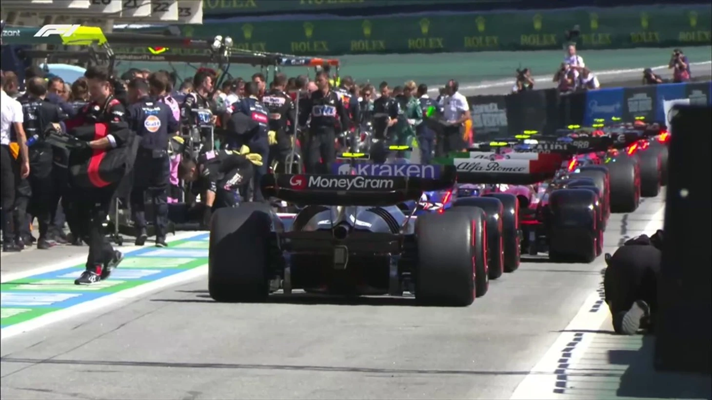 Пилоты начали выезжать из боксов и отправляются на стартовую решетку.