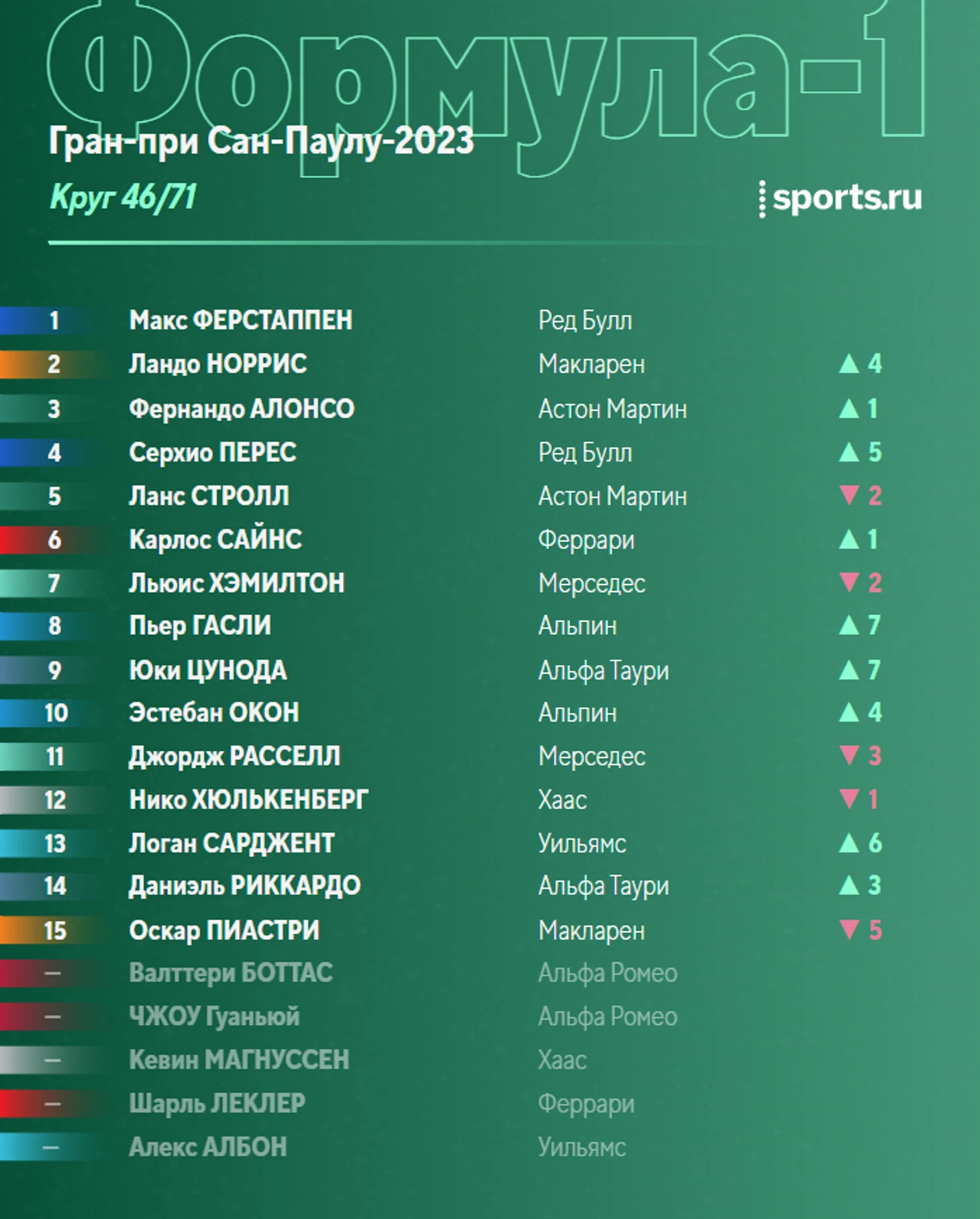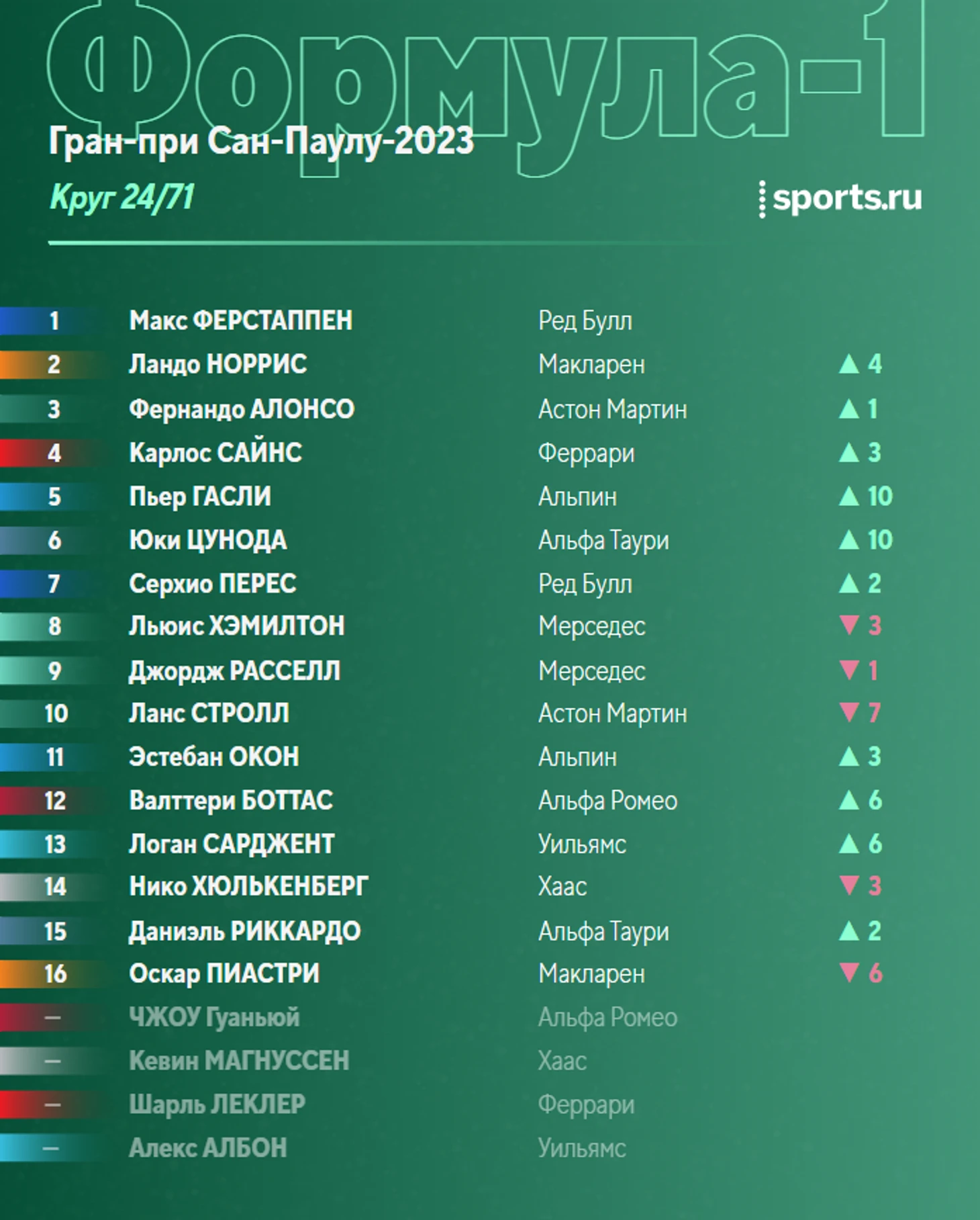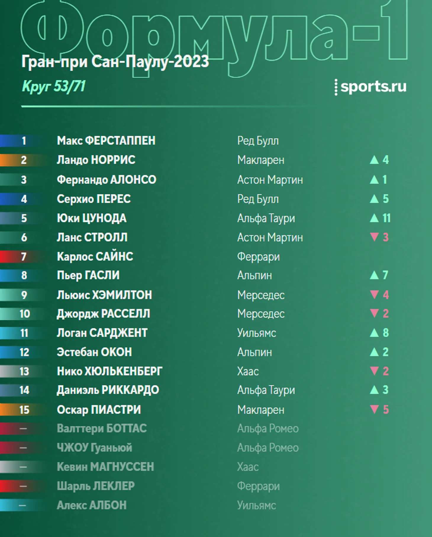 Пока участники активно готовятся к началу заезда, пару слов о перспективах борьбы за победу. Основная надежда – разумеется, на старт. И то, что Леклер зацепится за Ферстаппена, а сзади поддавят два пилота «Астон Мартин». Если же Макс уедет – будет плохо.
