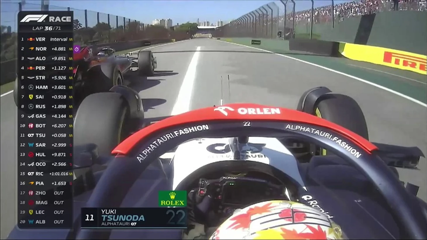 Между делом, после схода Риккардо гонку для «Альфа Таури» старается спасти Цунода. Получается неплохо. Юки недавно прошел Сарджента и попал в топ-10.