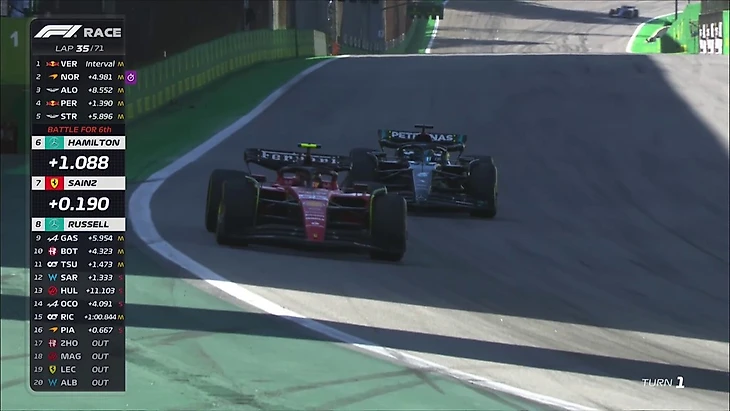 Тем временем, Сайнс, на единственной оставшейся в гонке «Феррари», бьется со Строллом. Ланс в конце круга тоже поехал в боксы, используя «андеркат».