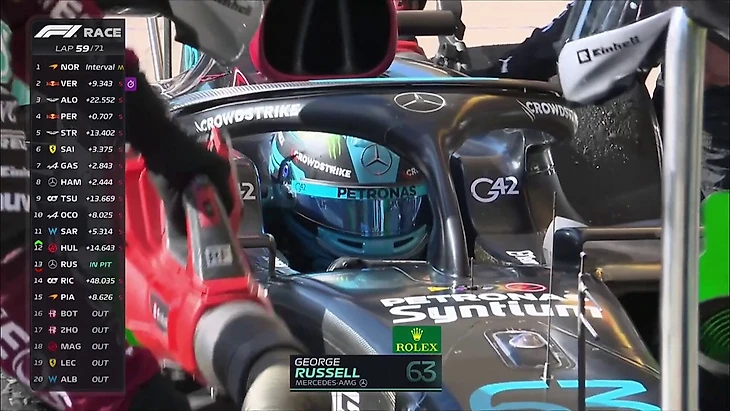 А вот мучения Расселла закончились - Джордж вернулся в боксы и сошел с дистанции. Официальная причина - опасно высокая температура масла в системе.