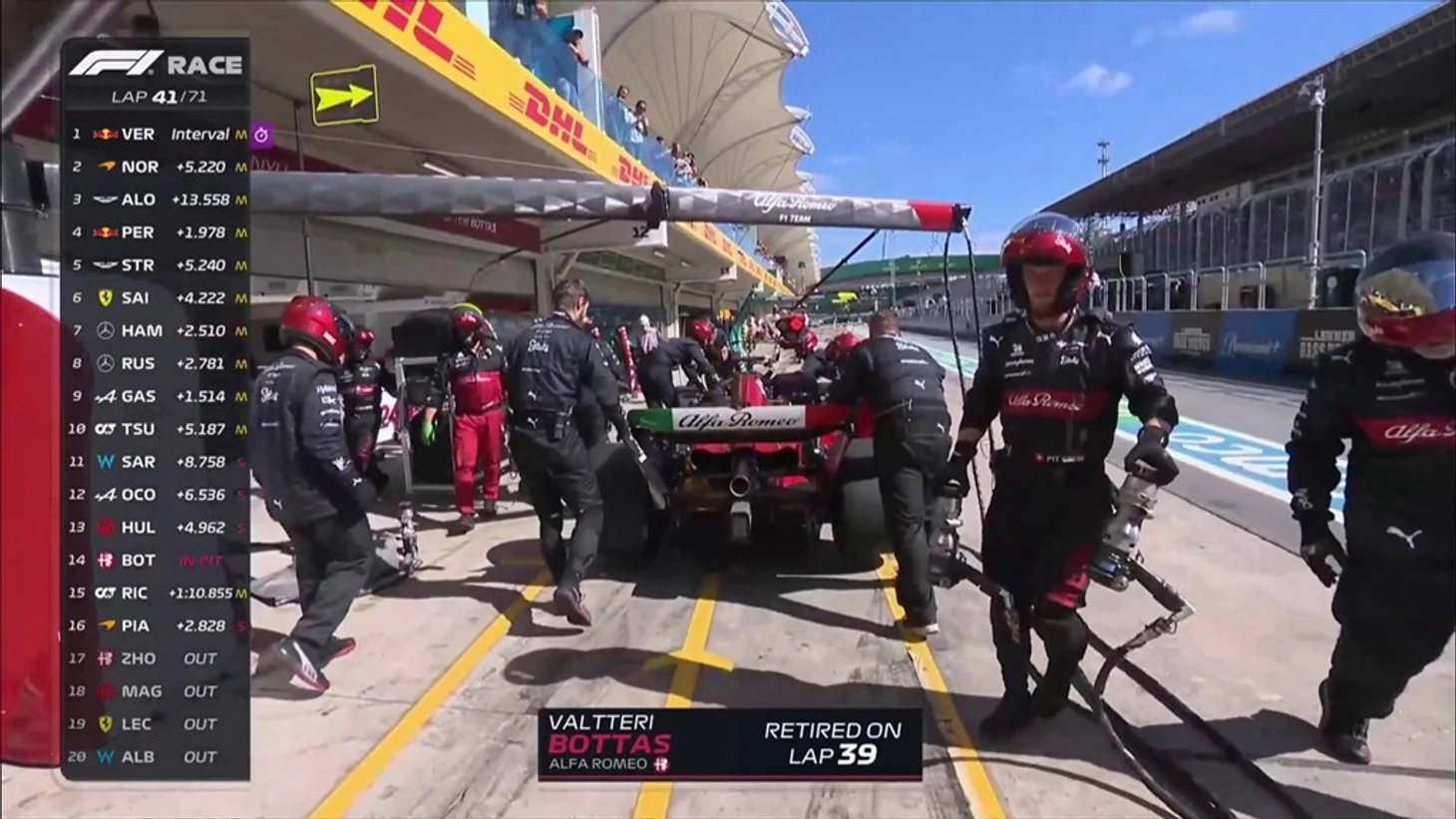 У нас снова минус один участник. На этот раз возвращается на пит-лейн и закатывает машину в боксы Валттери Боттас. Двойной сход для «Альфа Ромео».