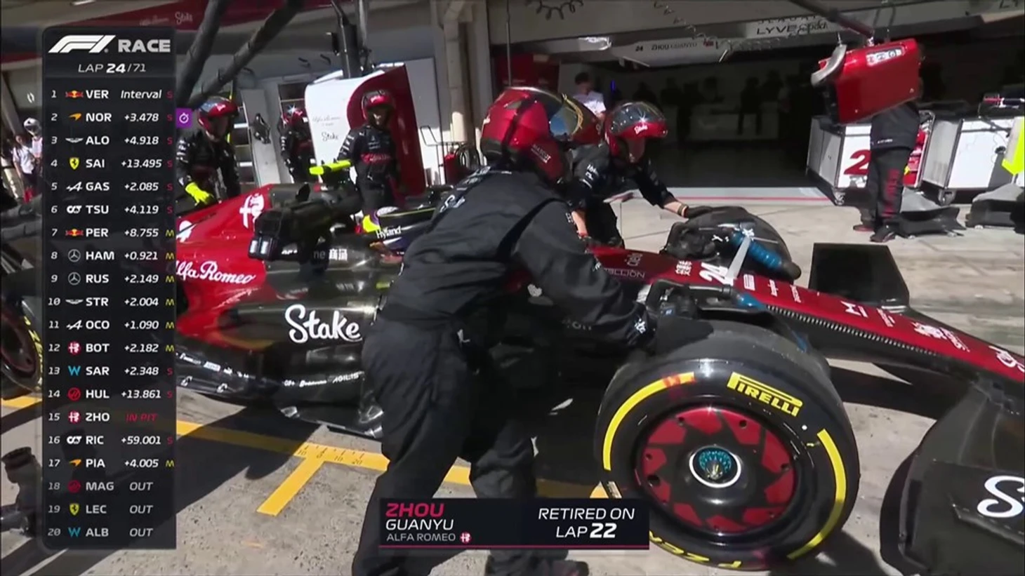 На этот раз гонку досрочно завершает Чжоу - болид «Альфа Ромео» закатывают в боксы.