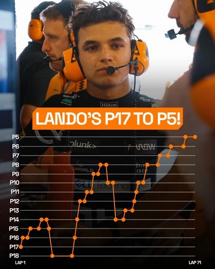 «Норрис был 17-м [на старте], но сумел претворить это в, пожалуй, свое самое впечатляющее выступление в «Ф-1» на данный момент, финишировав пятым благодаря выдающимся и дерзким обгонами.