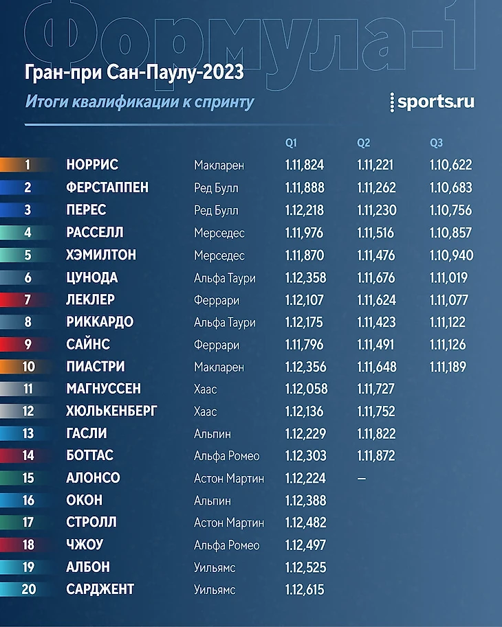 Спринт «Формулы-1» в Сан-Паулу проходил после масштабного урагана с ливнями и сильнейшими ветрами – за вечер и ночь всю накатанную резину смыло, и трек «Интерлагоса» вернулся в нейтральное состояние с низким сцеплением. Подобранные накануне в других условиях настройки оказались менее полезными – потому в квалификации к спринту ошибались вообще все из топ-10, а промежуточный поул занял пилот с наименьшим количеством помарок.