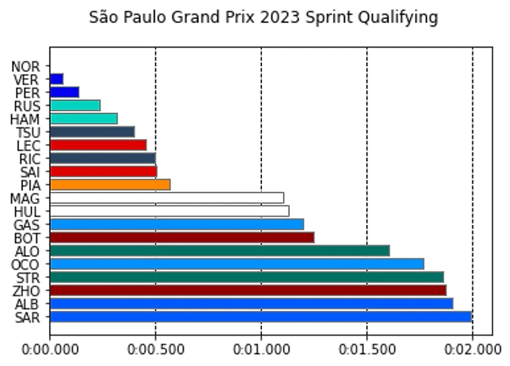 На графике показана разница между поул-позицией и лучшим кругом гонщика, показанного в квалификации к спринту Гран-при Сан Паоло 2023 года. Разница указана в секундах.