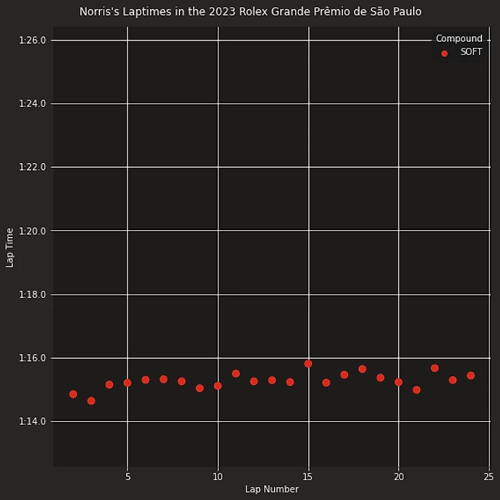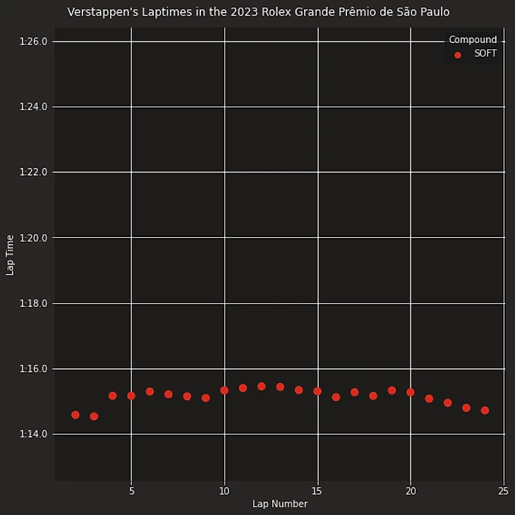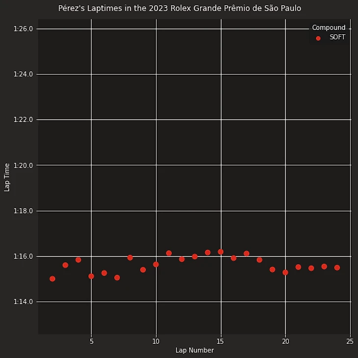 Нанесем на график время прохождения круга призеров спринта на Гран-при Сан-Паоло 2023 Макса Ферстаппена (победителя) Ландо Норриса (занявшего второе место) и Серхио Переса (занявшего третье место) в гонке с учетом типа шин.