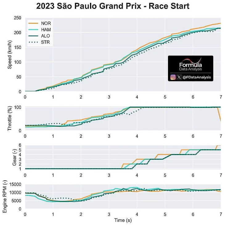 На Гран-при в бразильском Сан-Паулу старт выдался очень зрелищным: мощная авария на первых метрах, битва за подиум между четырьмя машинами… «Астон Мартин», «Мерседес», «Макларен» – все в игре, и это без учета драмы со сходом Шарля Леклера в «Феррари» на прогревочном круге!